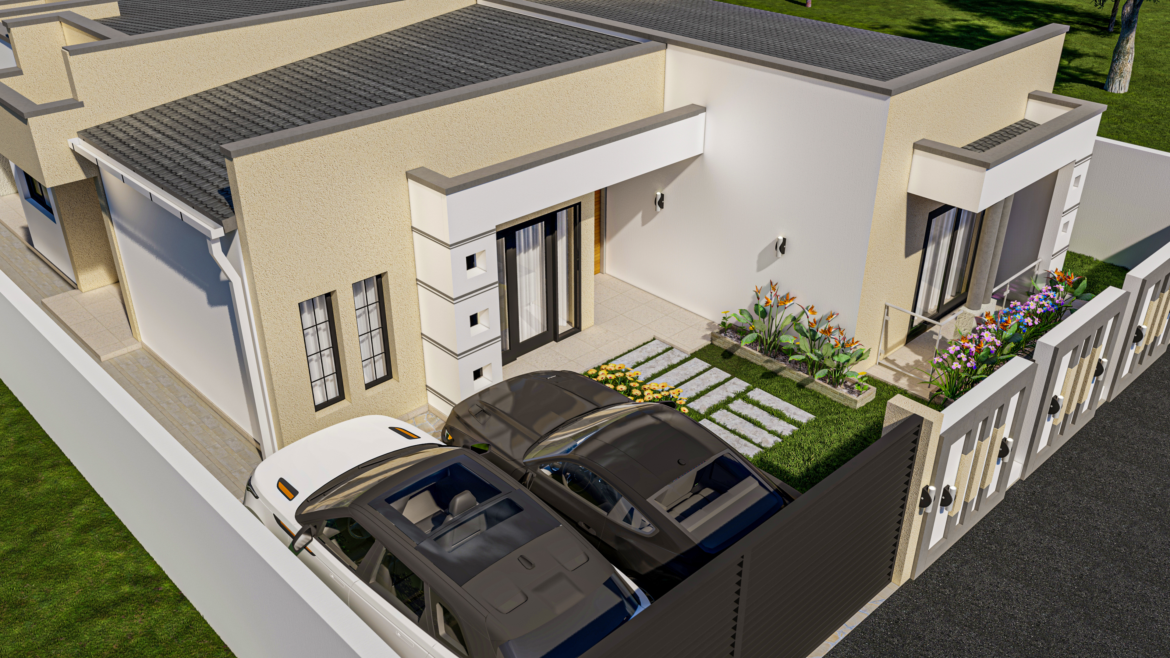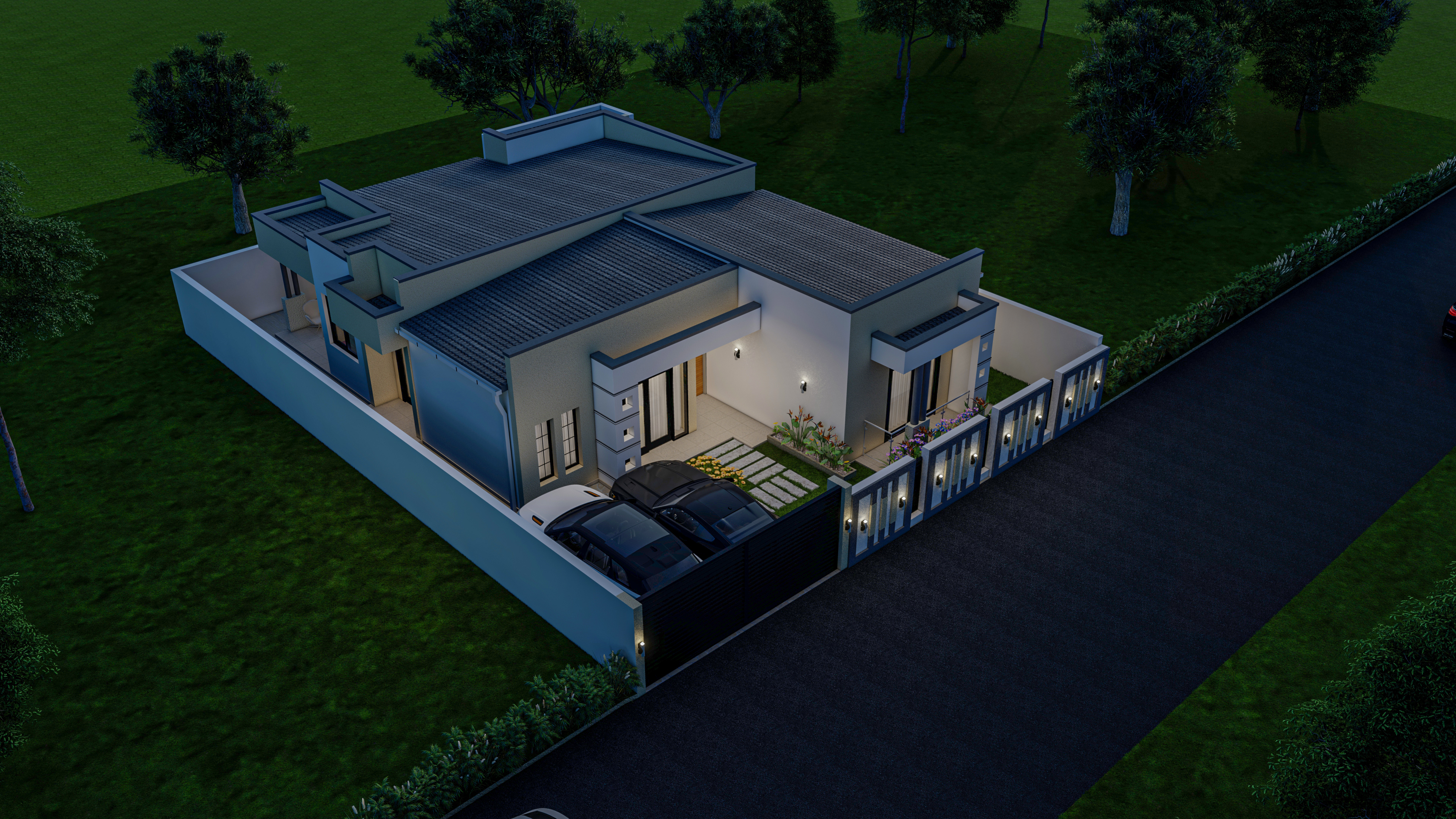 It has 4 bedrooms, 3 bathrooms, store, indoor kitchen, living room, Diningroom and annex, its was designed by MES Ltd and constructed bya MES Ltd at cost of 35 millions Rwandan francs.